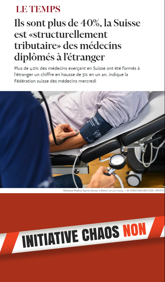 Au total, environ 40 % des mĂ©decins et 30 % du personnel soignant en Suisse sont originaires de lâĂ©tranger. Cette dĂ©pendance est particuliĂšrement forte dans les rĂ©gions frontaliĂšres, oĂč jusqu'Ă la moitiĂ© du personnel de santĂ© est originaire de lâĂ©tranger.